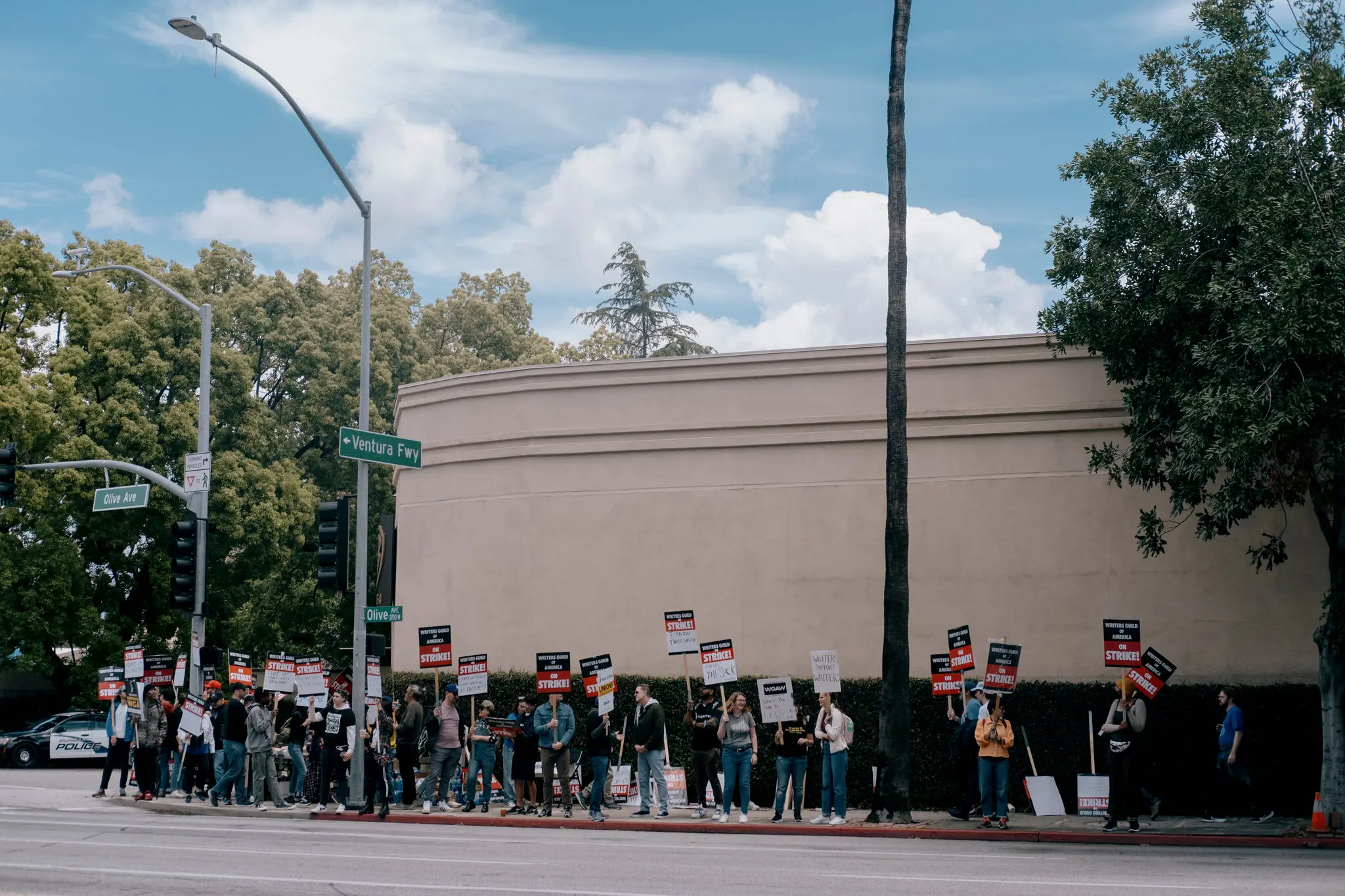 People marching on a picket line in Los Angeles holding signs about the WGA strike.