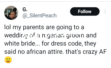 A Twitter user claimed that a Nigerian groom and his white wife told guests not to wear African attires to their wedding. “Lol my parents are going to a wedding of a Nigerian groom and white bride… for dress code, they said no African attire. that’s crazy AF, she tweeted on Monday. The post Nigerian groom and his white bride allegedly say no to African attire at their wedding appeared first on ringroad.com.ng.