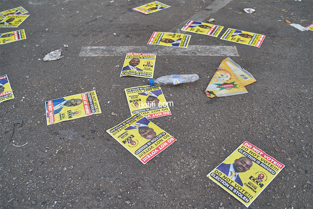 Flyers reading “Do not vote” are seen strewn on the street during Zimbabwe’s presidential and legislative elections in Bulawayo on August 23, 2023. (Photo by Zinyange Auntony / AFP)