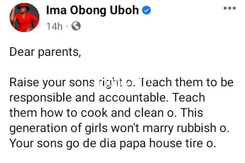 A Nigerian lady, Ima Obong Uboh, has advised parents to raise their sons right “Dear parents, Raise your sons right o. Teach them to be responsible and accountable. Teach them how to cook and clean o. This generation of girls won’t marry rubbish o. Your sons go de dia papa house tire o. I say make I update una,” she wrote. The post Raise your sons right, teach them how to cook and clean. This generation of girls won’t marry rubbish – Nigerian lady advises parents appeared first on ringroad.com.ng.