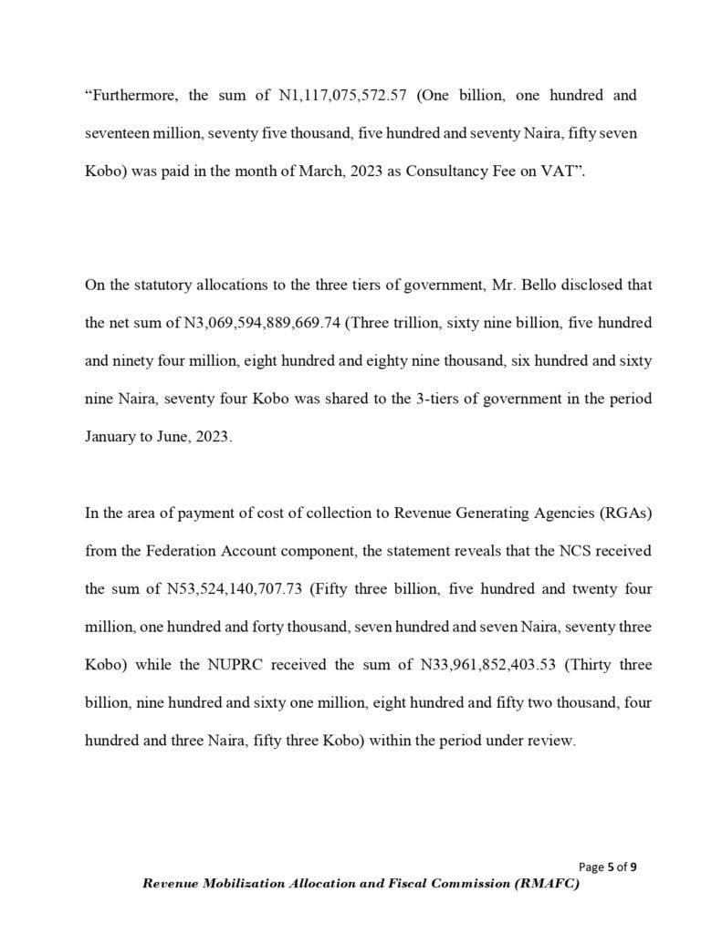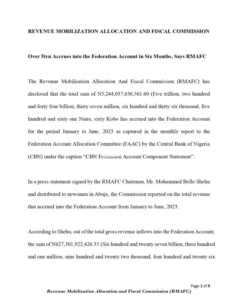 The Revenue Mobilisation Allocation And Fiscal Commission (RMAFC) says a total of N5,244,037,636,561.60 has accrued into the Federation Account for the period between January and June 2023.