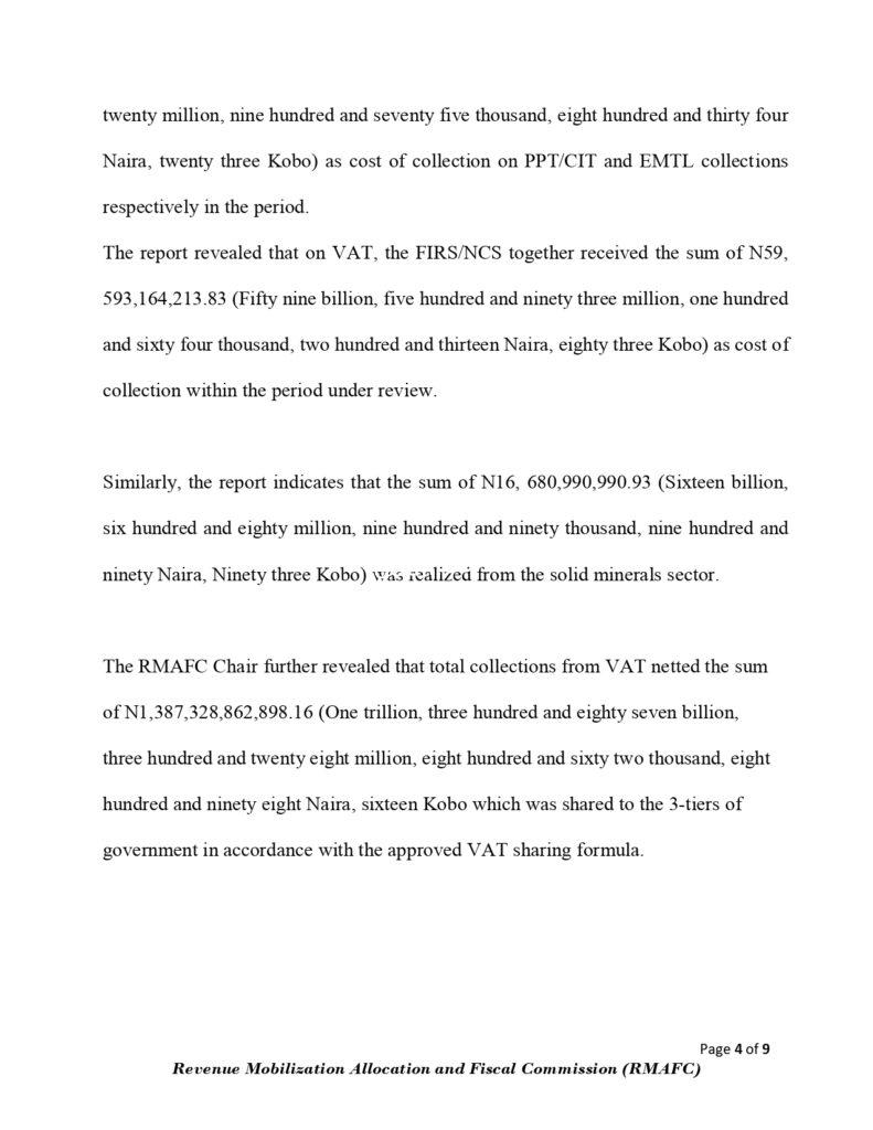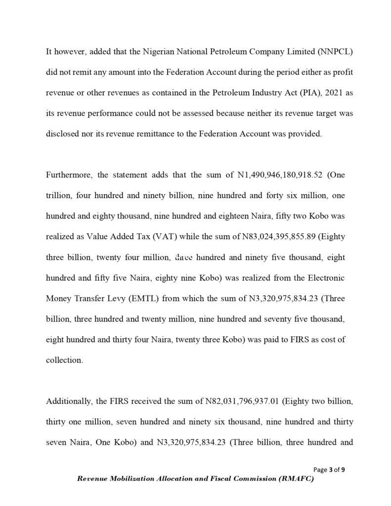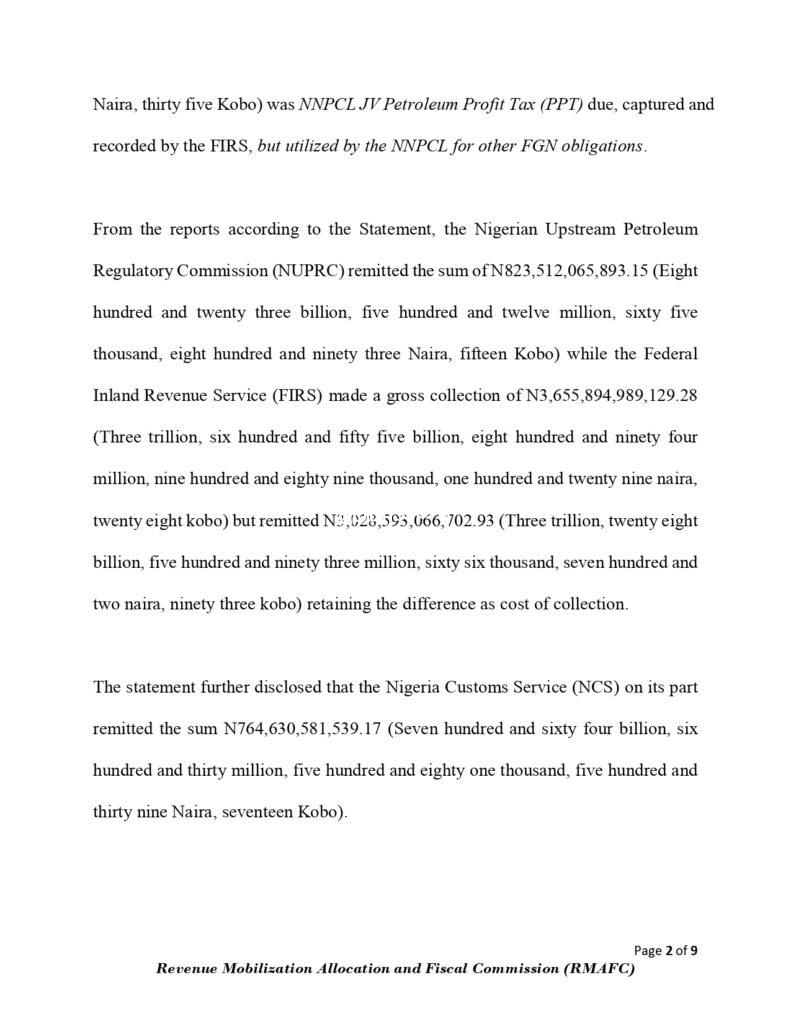 From the reports, according to the statement, the Nigerian Upstream Petroleum Regulatory Commission (NUPRC) remitted the sum of N823,512,065,893.15 while the Federal Inland Revenue Service (FIRS) made a gross collection of N3,655,894,989,129.28 but remitted N3,028,593,066,702.93 retaining the difference as cost of collection.
