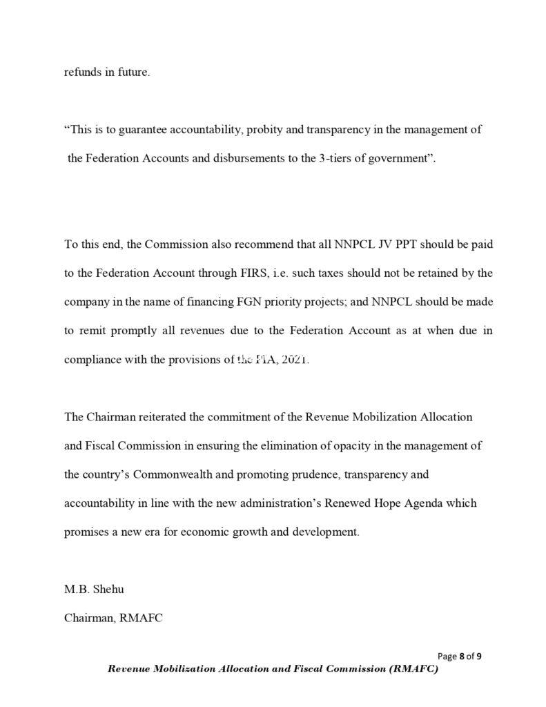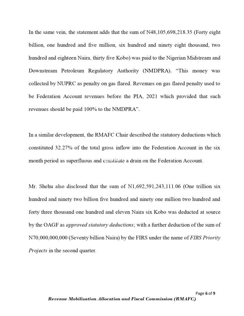 The RMAFC Chairman, Mr Mohammed Bello Shehu, in a statement on Wednesday, said out of the total gross revenue inflows into the Federation Account, the sum of N627,301,922,426.35 was NNPCL JV Petroleum Profit Tax (PPT) due, captured and recorded by the FIRS, but utilized by the NNPCL for other FGN obligations.