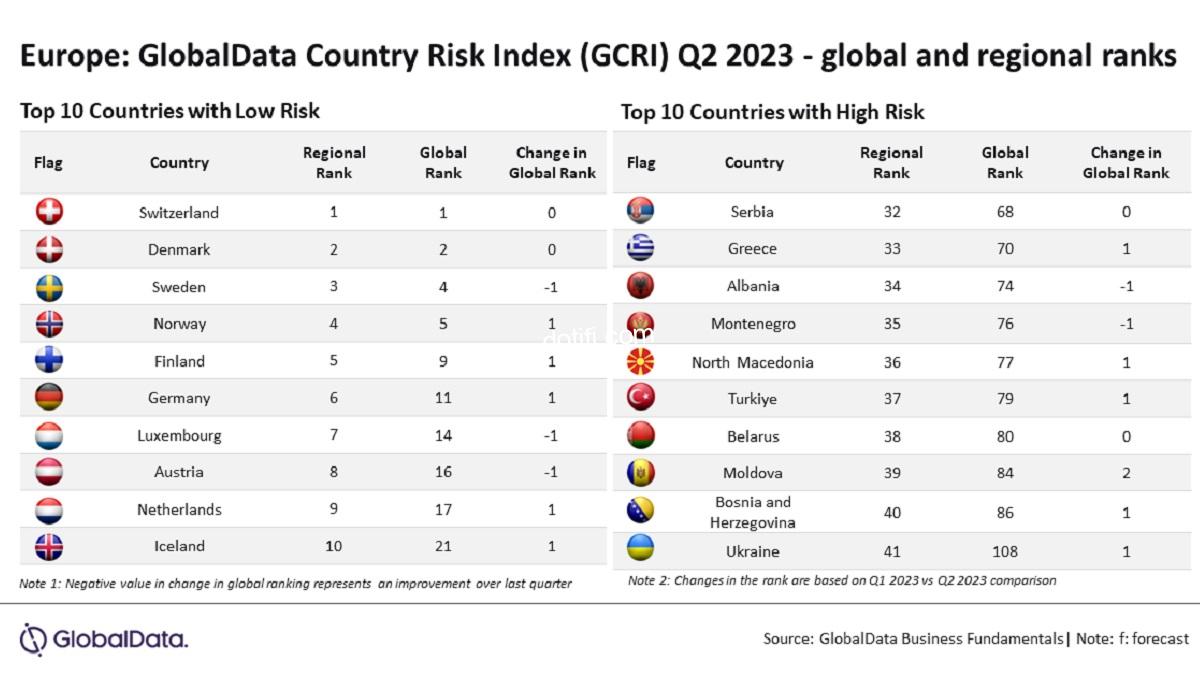 In the Q2 2023 GCRI update, Switzerland, Denmark, Sweden, Norway, Finland, Germany, and Luxembourg were among the top 15 lowest-risk nations out of 153 countries. Within Europe, Ukraine, Bosnia and Herzegovina, and Moldova were the nations with the highest risk in the same update.