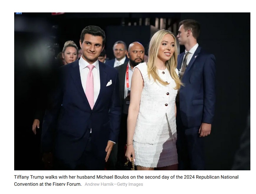 Tiffany Trump walks with her husband Michael Boulos on the second day of the 2024 Republican National Convention at the Fiserv Forum.Andrew Harnik—Getty Images