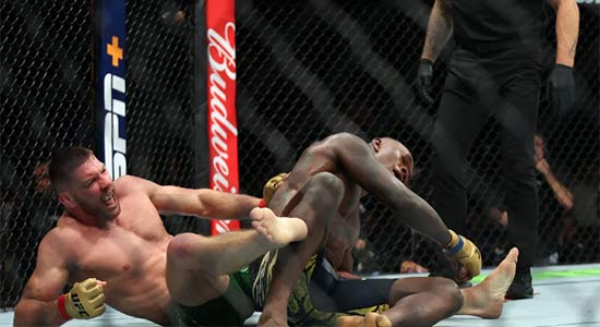 BBC sports reports that Du Plessis (22-2), after scoring some early takedowns, had to withstand a flurry of strikes from Adesanya through the middle rounds which appeared to be taking a toll on the 30-year-old South African as the fight progressed.